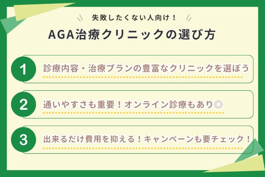 安心してください。ここでは実際に治療経験がある方々の口コミや医療機関の比較情報をもとに、後悔しないAGAクリニック選びのポイントを3つに絞って解説します。