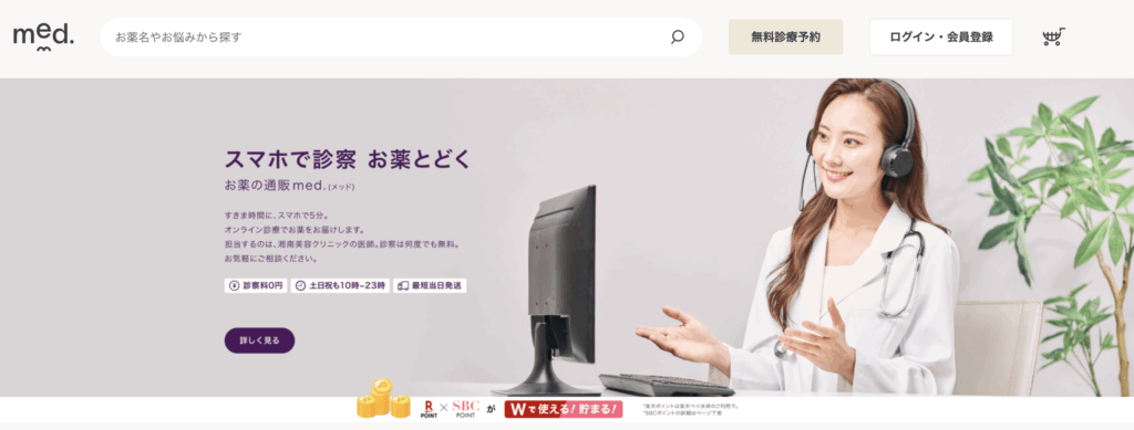 | 当日診察 | 10:00〜24:00間の予約で可能 | 配送料 | ¥550 |